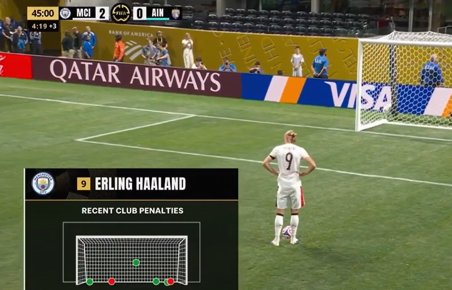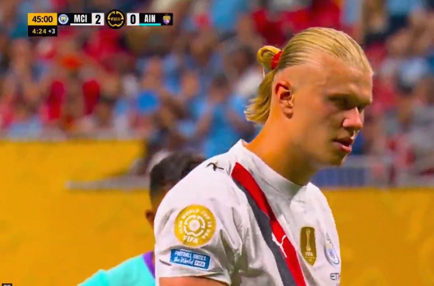 在上半场行将限度的之后,又一个男东谈主站出来了,他即是哈兰德,队友阿坎吉造点,主裁判在经由VAR回看之后,坚忍判罚了点球,哈兰德站在12码前,低射球门右侧,艾因队门将告成判断错了,这球有了,挪威锋霸哈兰德也收货了个东谈主世俱杯的首粒进球!事实上除了点球,哈兰德还有一次单刀破门契机,他在前场抢断后卫后晃过门将挑射,可惜球滑门而过。
