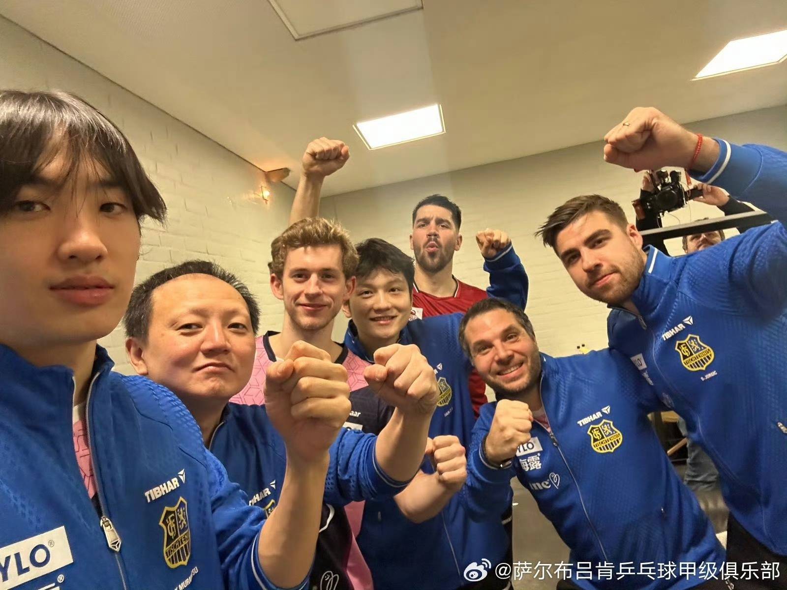 萨尔布吕肯俱乐部在赛后庆祝。图源:俱乐部官方微博樊振东为萨尔布吕肯队获得无缺开局。第一局,在先丢1分后,樊振东连拿11分到手。第二局,两边在开局阶段打成3:3,樊振东随后连得7分,以11:5拿下。第三局,樊振东一样以11:5胜出。